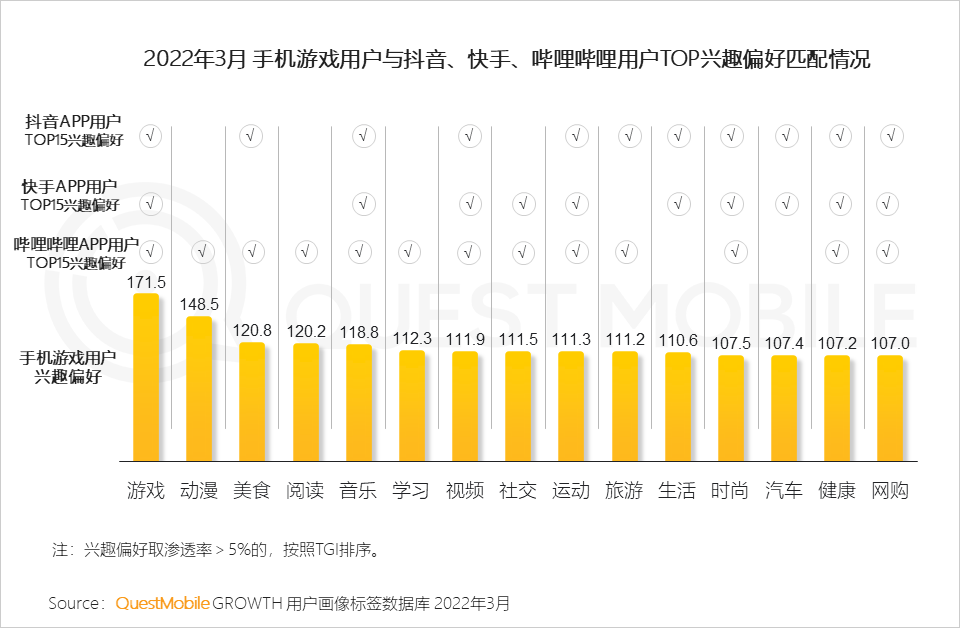 5、抖音、快手、哔哩哔哩等内容平台用户兴趣偏好与游戏用户兴趣偏好高度匹配,内容平台在游戏用户中的价值得以突显