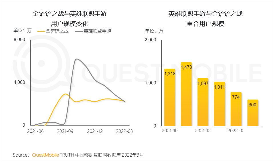 知名游戏IP“英雄联盟”改编的《英雄联盟手游》《金铲铲之战》上线初期用户规模迅速增长至千万级别,受同一IP改编的影响,两款游戏前期重合用户规模达到千万。