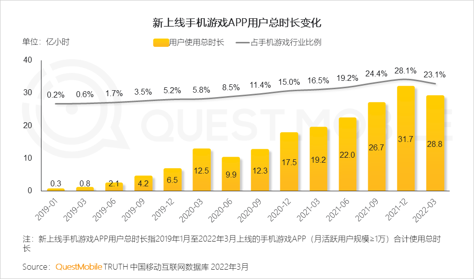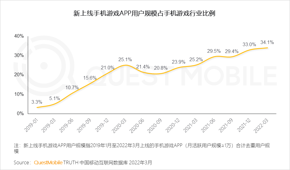 1.2 在2019年1月至2022年3月期间新上线游戏产品,逐渐成为手机游戏行业的重要组成部分,用户规模占比超过三成,版号在经历首次暂停与恢复后,对新上线游戏产品的精品化刺激明显