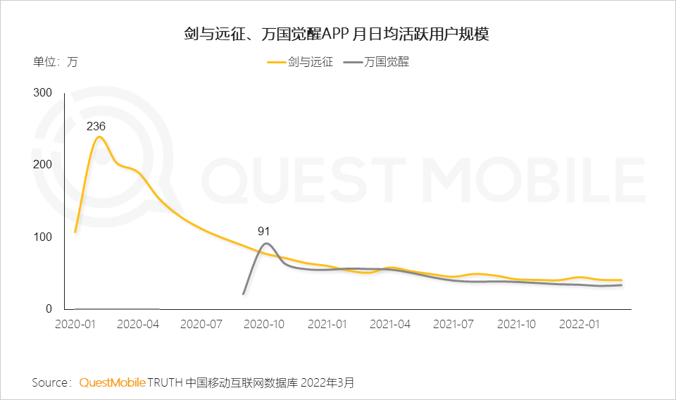 《剑与远征》《万国觉醒》在国内上线初期月日均活跃用户表现良好,但是后续缺乏突破性表现。
