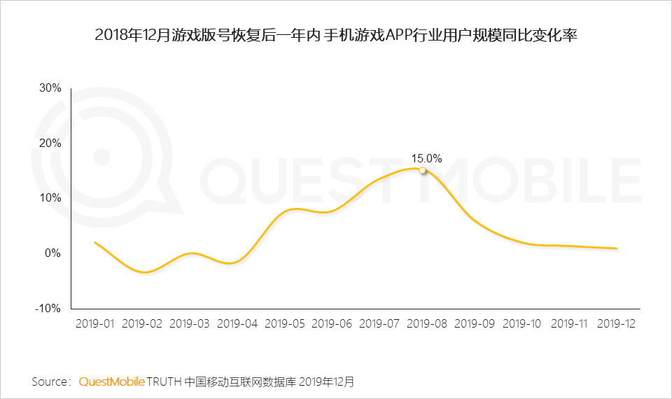 QuestMobile数据显示,在2018年12月,游戏版号首次经历暂停恢复后,手机游戏市场经历了一定程度的反弹,在2019年8月,活跃用户规模同比增长率一度达到15%。