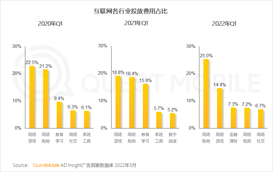 2、整体线上广告投放市场中,游戏行业长期位列前两位