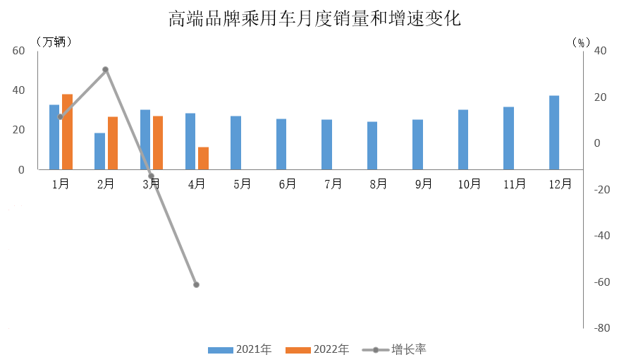 2022 年 4 月,国内生产的高端品牌乘用车销量完成 11.4 万辆,同比下降 61.5%,降幅大于乘用车总体。