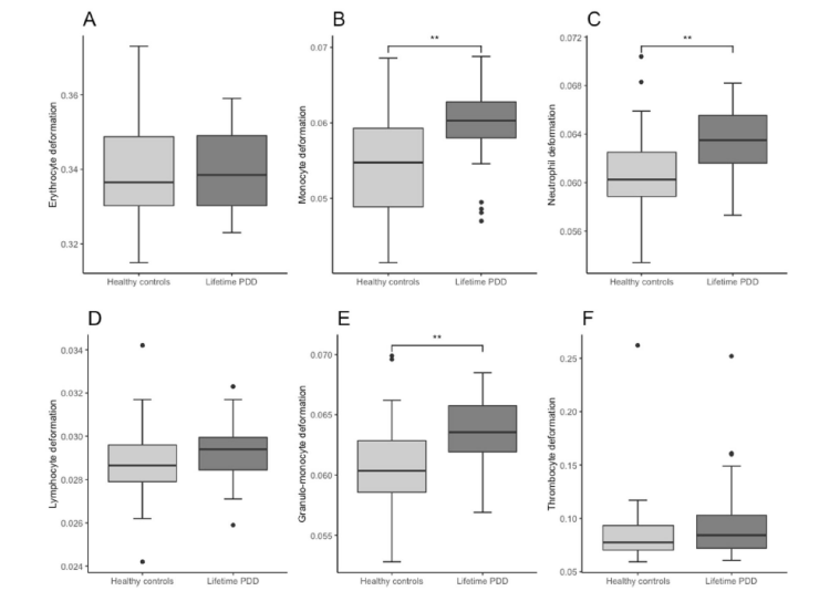 近期,来自德国德累斯顿工业大学Andreas Walther课题组的研究人员在Translational Psychiatry期刊发表重要研究成果[2]。抑郁症患者,尤其是持续性抑郁障碍(PDD)患者相较于健康人群的外周血细胞变形性更强。其中,淋巴细胞,单核细胞和中性粒细胞是受抑郁症影响最大的免疫细胞。