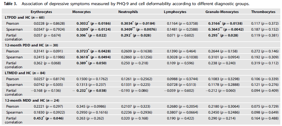 结果显示,在终身持续性抑郁障碍组中,PHQ-9评分与单核细胞,中性粒细胞,以及颗粒-单核细胞变形性增强有关。此外,在1年持续性抑郁障碍和1年持续性抑郁症中,PHQ-9评分分别与单核细胞和红细胞变形性增强独立相关。
