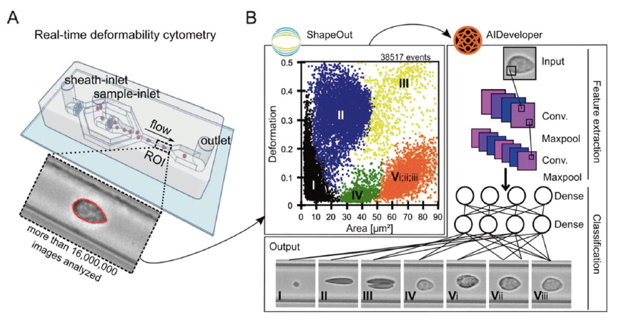 图一. 实时细胞变形性计数仪和后续基于人工智能的血细胞分方法示意图。