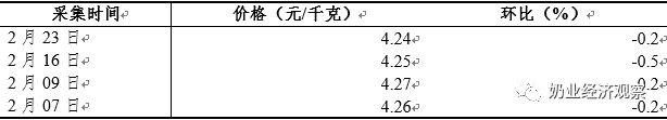 据农业农村部监测数据,2022年2月生鲜乳价格环比下跌,从周价来看,有3周价格环比下跌。2月月度均价4.26元/千克,环比下跌0.2%,同比下跌0.7%。最后一周4.24元/千克,比前一周下跌0.2%,同比下跌1.2%。