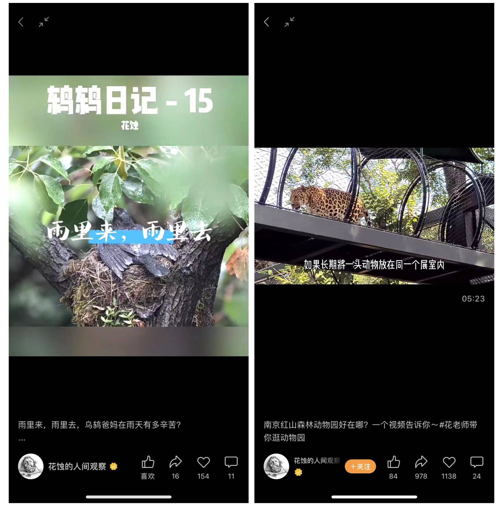 2020年,因疫情困于家中的花蚀观察到一对乌鸫在家里阳台外的树上筑了巢,分享这个生命诞生的过程成为他开通视频号的契机。而视频号开通后,花蚀便把逛动物园的视频上传至视频号,使得账号积累了众多粉丝,大家纷纷打开视频号直播跟着花蚀“云逛”各个动物园。