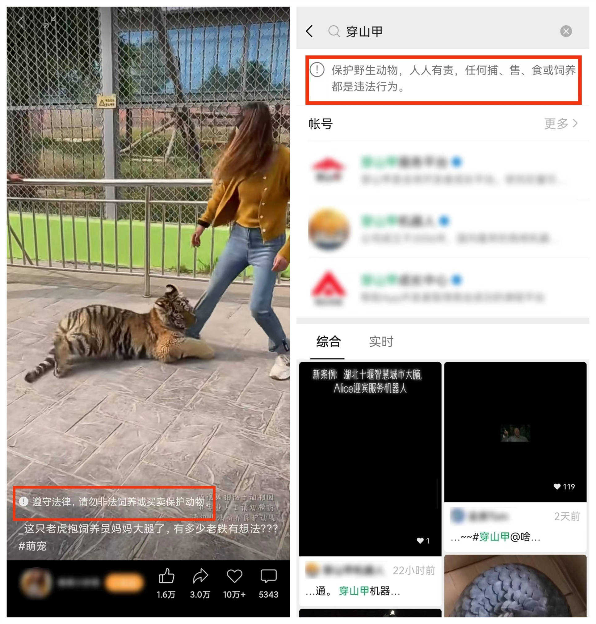 5月22日,是第29个国际生物多样性日,今年的主题是“共建地球生命共同体”。为响应该主题,微信视频号于近日上线了呼吁保护野生动物的提示语,以平台能力号召广大用户共同关注生物多样性保护工作——当用户在视频号搜索“穿山甲”、“犀牛”等珍稀动物和相关关键词,或当刷到野生动物类短视频时,都有可能看到呼吁保护野生动物的提醒。