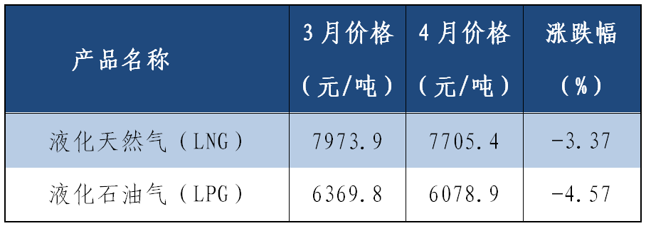 4 月国内 LNG 和 LPG 价格小幅下降。4 月下旬 LNG 价格环比下降 268.5 元 / 吨,至 7705.4 元 / 吨,降幅 3.37%;LPG 价格环比下降 290.9 元 / 吨,至 6078.9 元 / 吨,降幅 4.57%。