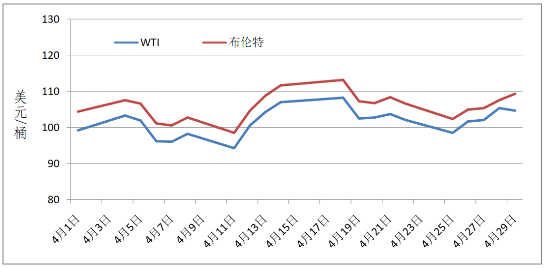 图 1 2022 年 4 月 WTI 和布伦特原油价格走势