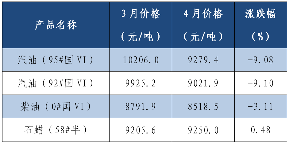 4 月国内成品油价格呈下行态势。4 月下旬 95 号汽油价格环比下降 926.6 元 / 吨,至 9279.4 元 / 吨,降幅 9.08%;92 号汽油价格下降 903.3 元 / 吨,至 9021.9 元 / 吨,降幅 9.10%;柴油价格环比下降 273.4 元 / 吨,至 8518.5 元 / 吨,降幅 3.11%。