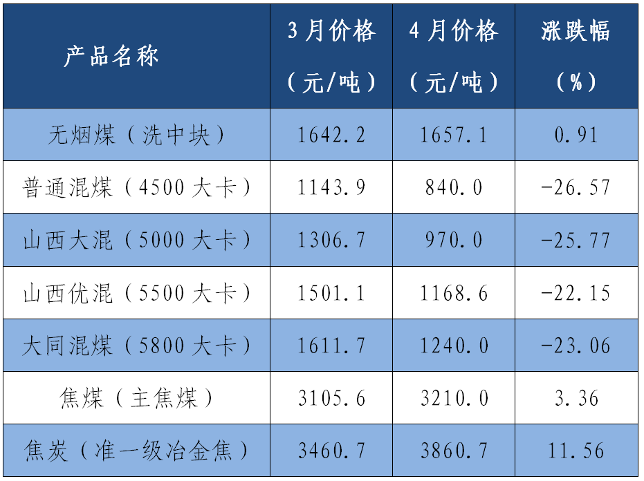 4 月国内煤炭市场价格以降为主。4 月下旬无烟煤价格环比上涨 14.9 元 / 吨,至 1657.1 元 / 吨,涨幅 0.91%;普通混煤(4500 大卡)价格环比下降 303.9 元 / 吨,至 840.0 元 / 吨,降幅 26.57%;山西大混(5000 大卡)价格环比下降 336.7 元 / 吨,至 970.0 元 / 吨,降幅 25.77%;焦煤价格环比上涨 104.4 元 / 吨,至 3210.0 元 / 吨,涨幅 3.36%。