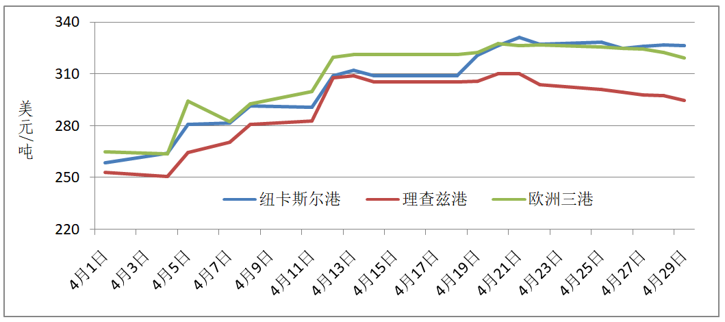 4 月 8 日,欧盟对俄罗斯实施新一轮制裁措施,包括禁止从俄罗斯进口所有类型的煤炭。这是俄罗斯对乌克兰发起特别军事行动以来,欧盟首次针对俄罗斯能源实施制裁。欧盟每年进口的煤炭中 45% 来自俄罗斯,总值约 40 亿欧元。欧盟决定制裁俄罗斯煤炭后,全球动力煤市场供需紧张局势加剧,欧洲三港动力煤期货价格应声上涨。