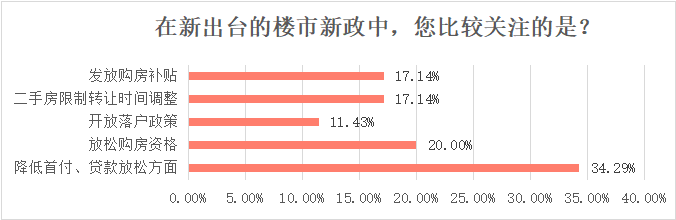 对于 “楼市新政”,调查结果显示,56.67% 的网友非常关注楼市新政。其中关注降低首付、贷款放松方面政策的网友最多,占比 34.29%;其次是关注放松购房资格;而关注开放落户政策的网友占比最少仅有 11.43%。