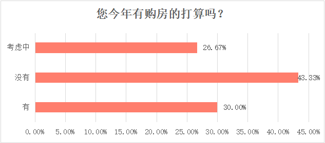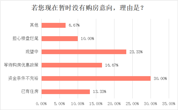 针对 “当前暂时没有购房意向的群体”,大多数网友认为主要问题还是购房预算不充足。调查结果显示,有 30% 的网友表示资金条件不充裕,23.33% 的网友表示正在观望中,而有 16.67% 的网友等待有合适的购房优惠政策才入手。