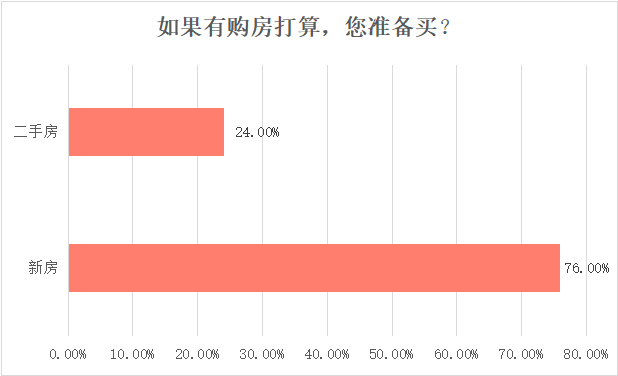 关于 “今年是否有购房打算”,调查结果显示,没有购房打算的网友比较多,占比 43.33%。占比 26.67% 的网友则表示正在考虑中。此外,对于有购房打算的网友,76% 的人打算买新房,24% 的人打算买二手房。