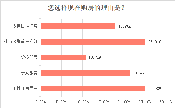 关于 “当前的购房理由”,调查结果显示,25% 的网友选择了刚性住房需求,25% 的网友是受到楼市松绑政策利好影响,21.43% 的网友考虑到子女教育,另有 17.86% 的网友是想改善居住环境。