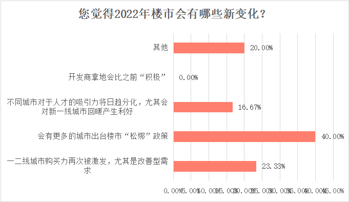 对于 “2022 年楼市会有哪些变化”,调查结果显示,超 0% 的网友认为,接下来会有更多城市出台楼市“松绑” 政策,且一二线城市购买力会再次被激发,尤其是改善型需求。另外也有 16.67% 的网友认为不同城市对于人才的吸引力将日趋分化,尤其会对新一线城市回暖产生利好。值得一提的是,没有网友认为开发拿地会比之前“积极”。