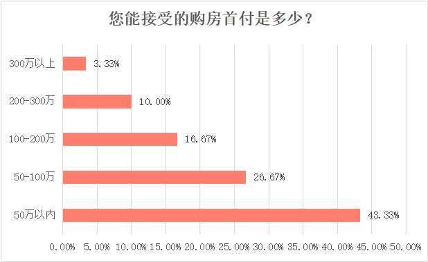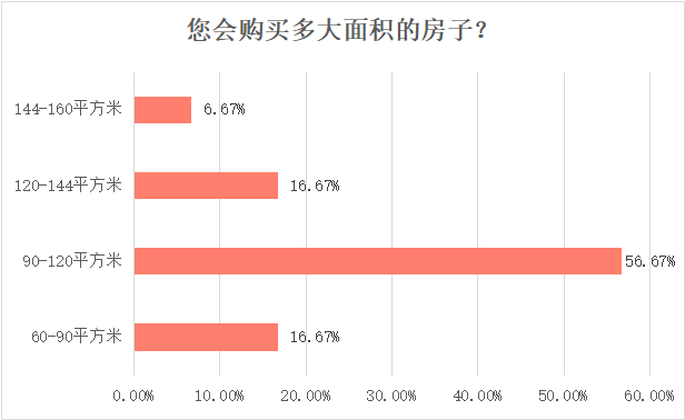 在 “购房首付、购房考虑因素、购房面积段” 等方面,调查结果显示,选择 50 万首付款以内的网友最多占比 43.33%,其次是选择 100 万以内首付的网友。购房因素方面,认为价格更为重要的网友居多,占比 23.36%,其次是考地段位置。面积段上,56.67% 的网友会选择 90-120 平米的户型。