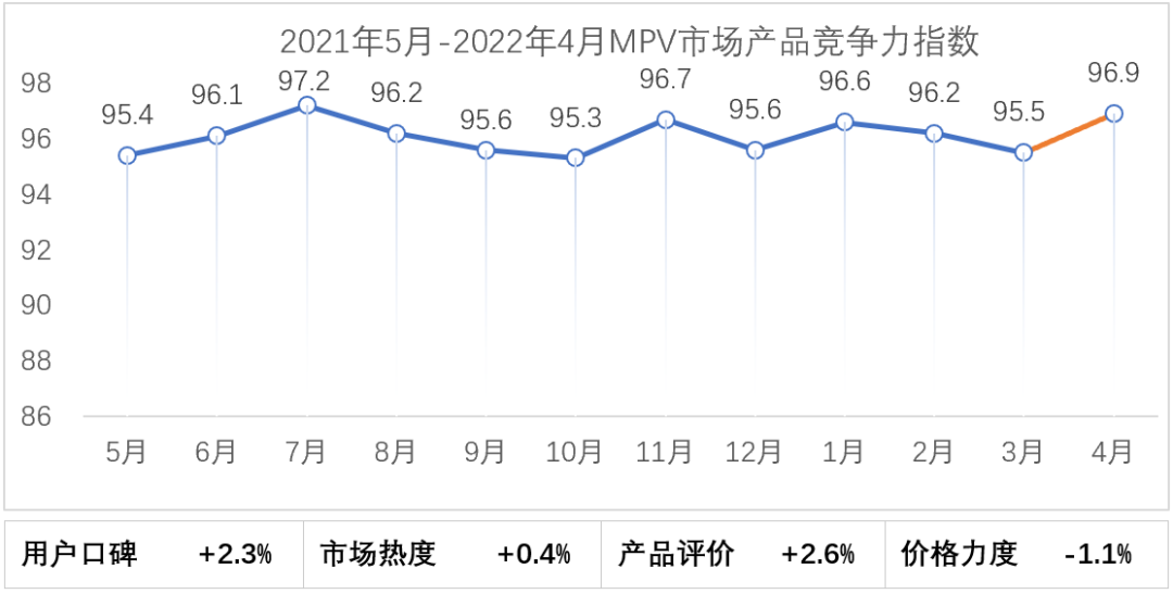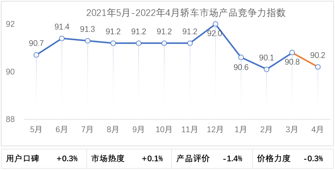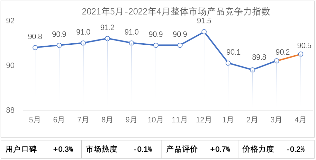 以2019年1月为基期,2022年4月整体市场产品竞争力指数为90.5,环比上升0.3个点;从三大细分市场来看,轿车市场环比下滑0.6个点,SUV和MPV市场分别环比上升1.8和1.4个点。