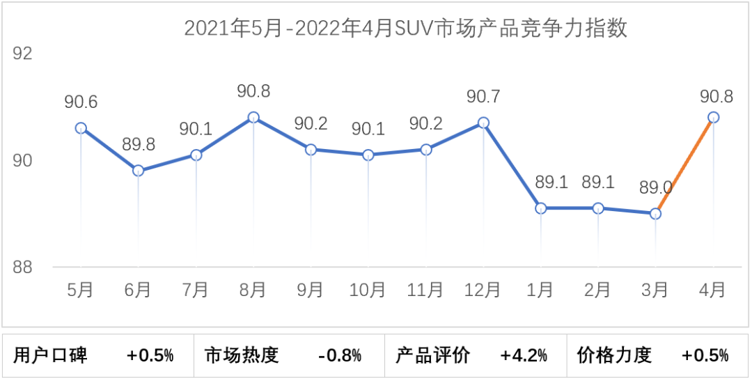 总体来看,2022年4月SUV市场产品竞争力指数为90.8,环比上升1.8个点,由于4月CR-V、CS75 PLUS、缤智、XR-V等SUV主销车型批发量大幅下跌,使得产品评价指标环比明显上升,上升幅度达4.2个点。