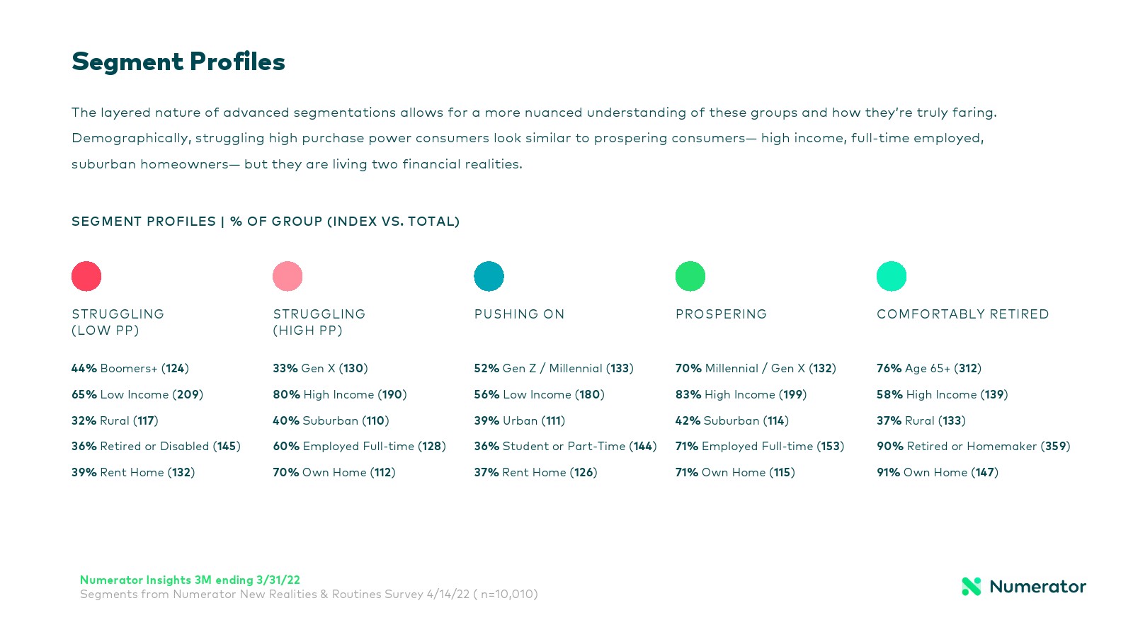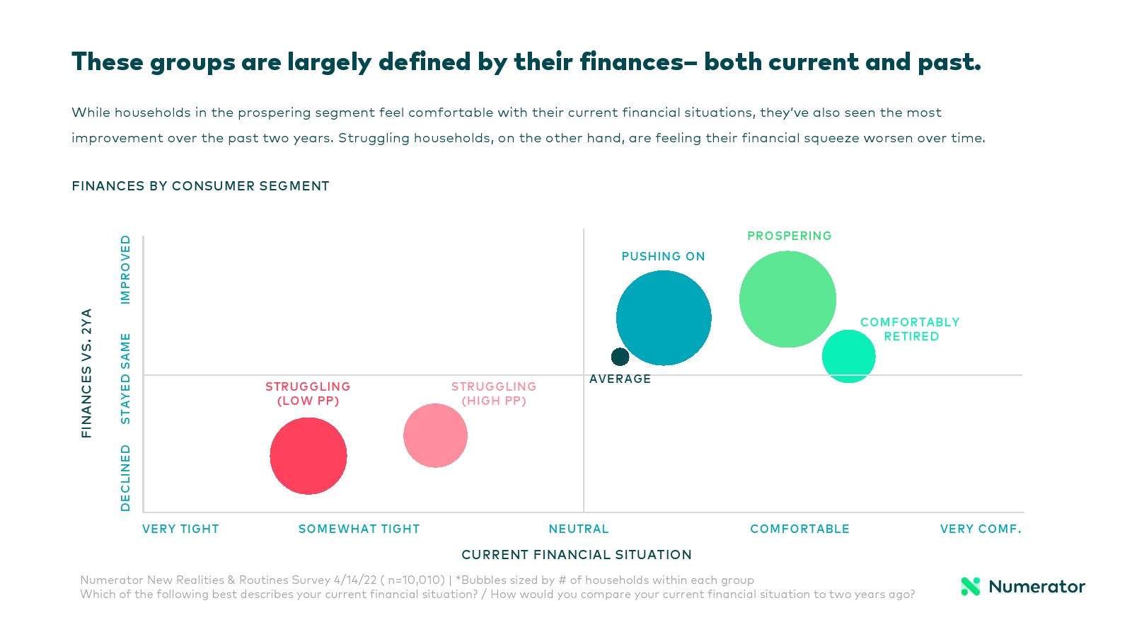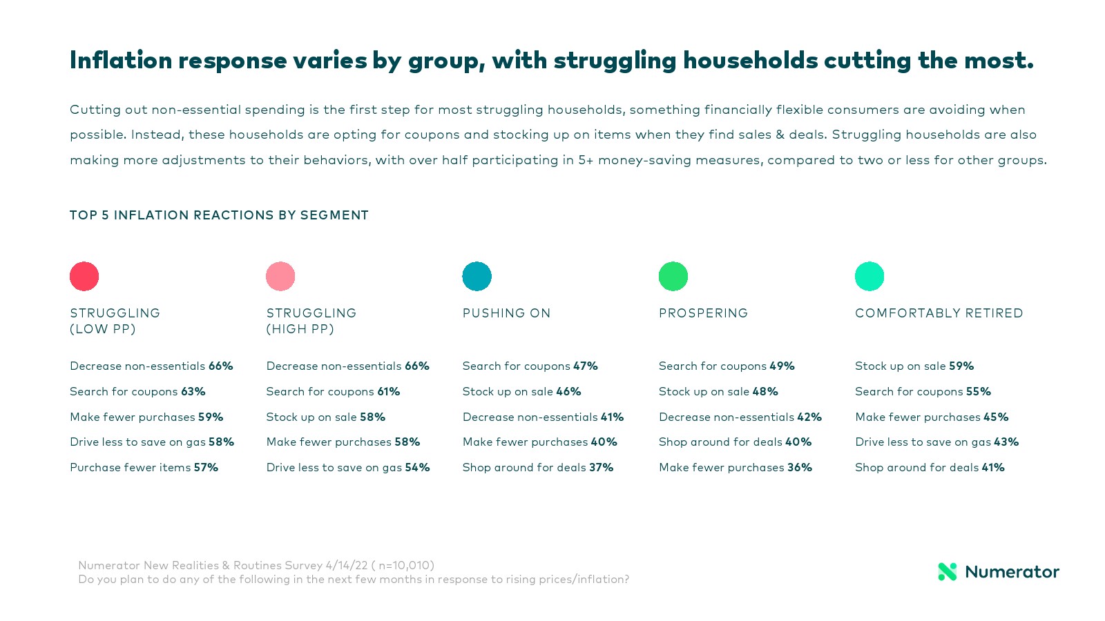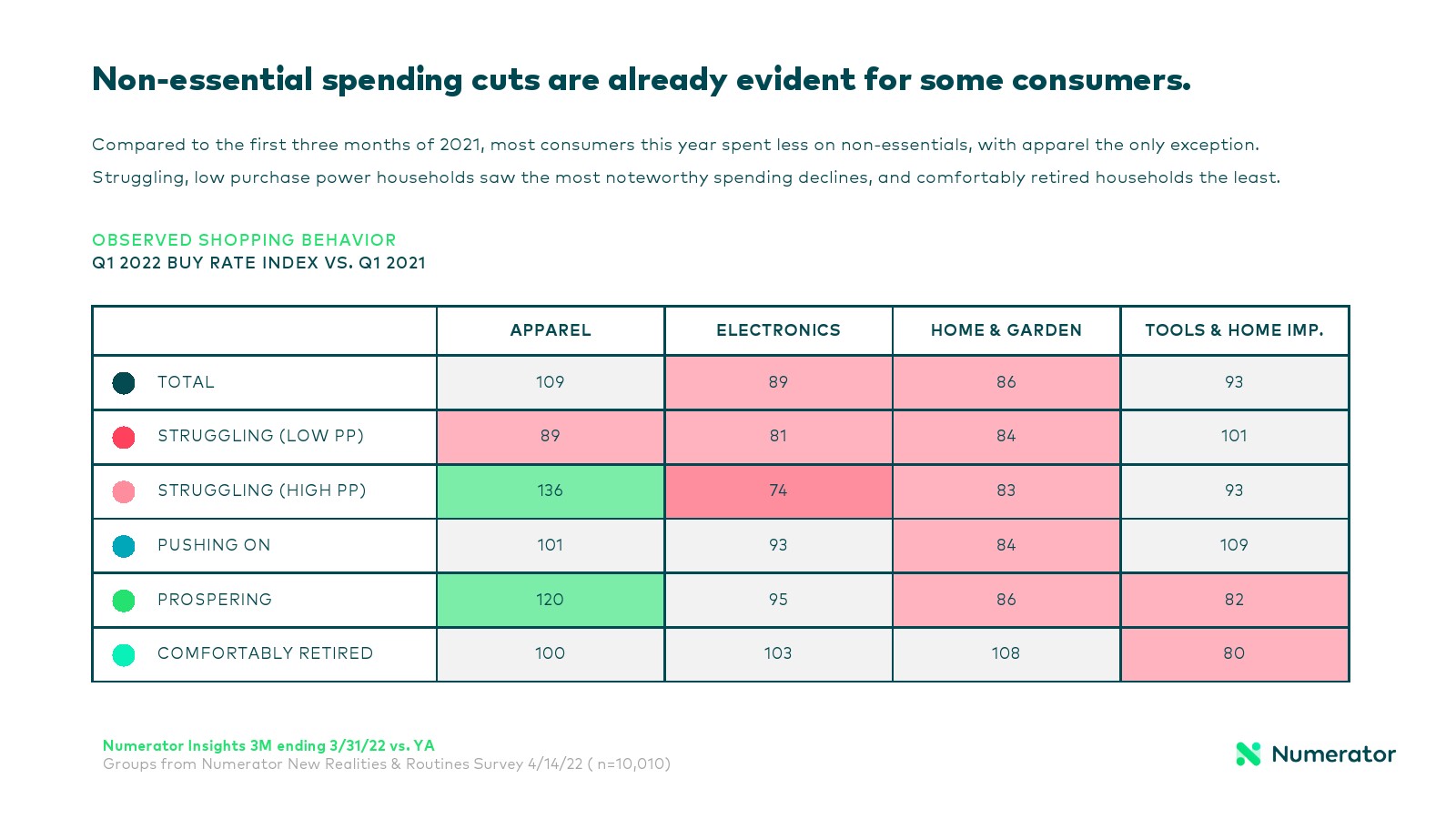 - 与 2021 年相比,2022 年前三个月非必需品类的支出有所下降,尤其是在购买力低下的苦苦挣扎的家庭中。