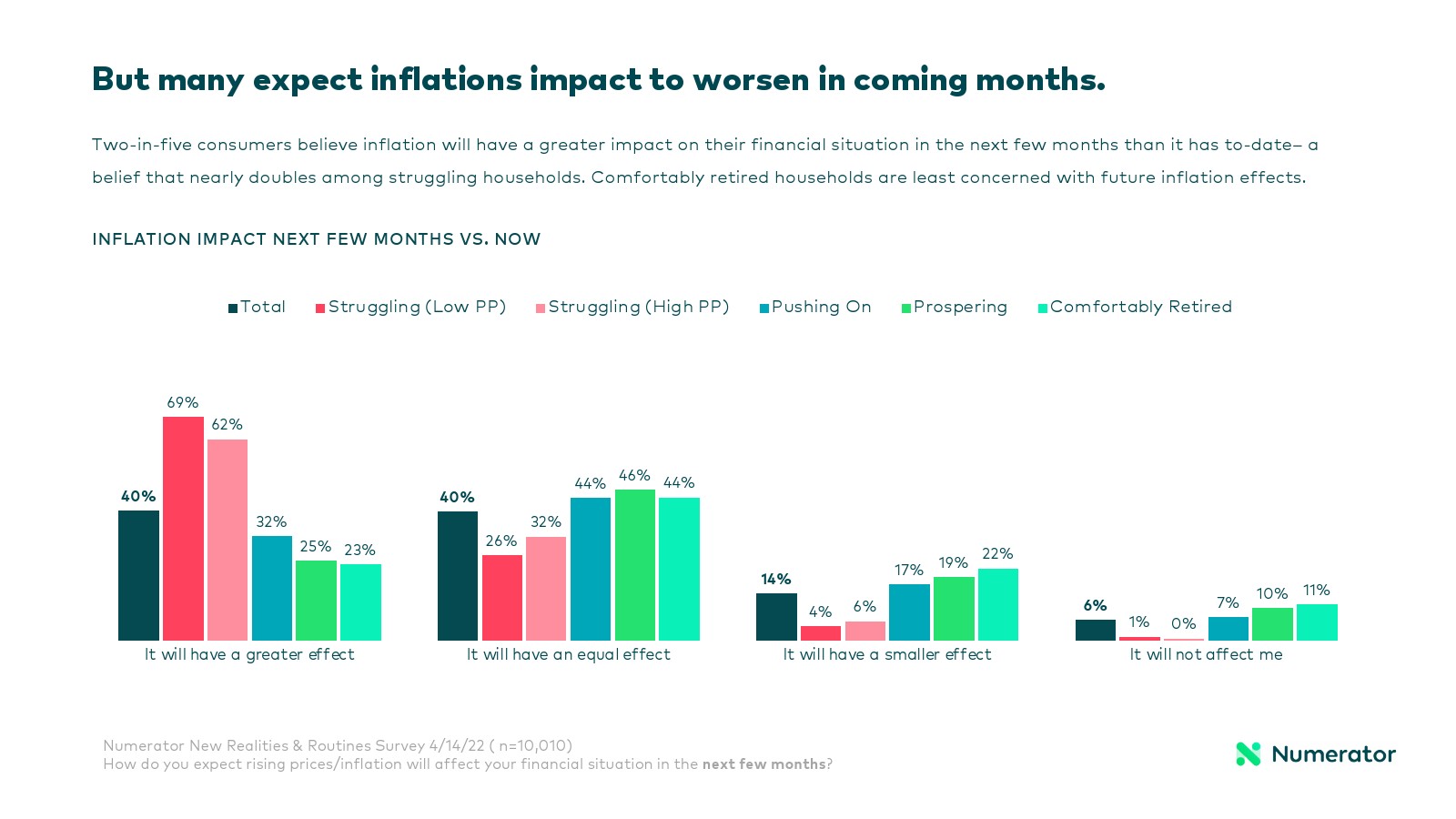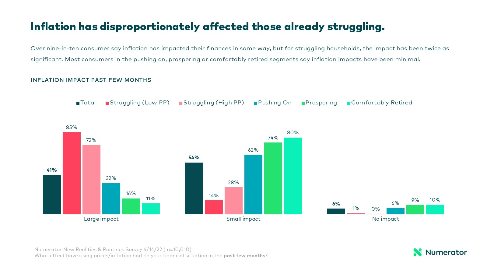 - 通货膨胀对那些已经陷入困境的消费者的影响更大,人们预计它会在好转之前变得更糟。超过9/10的消费者表示,通货膨胀以某种方式影响了他们的财务状况,但对于陷入困境的家庭来说,影响是两倍。