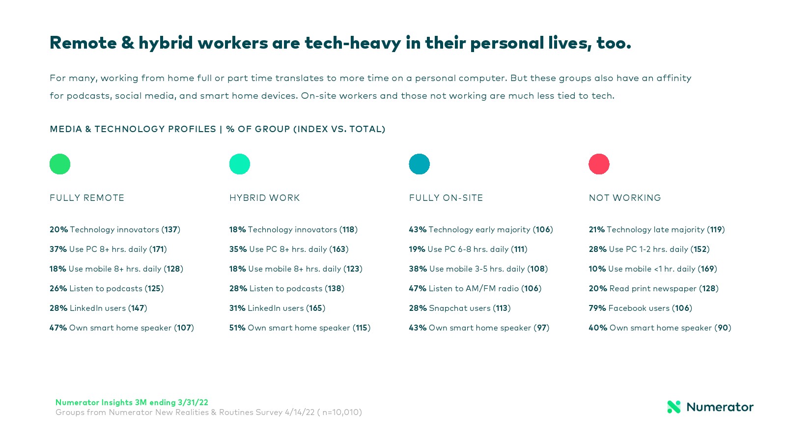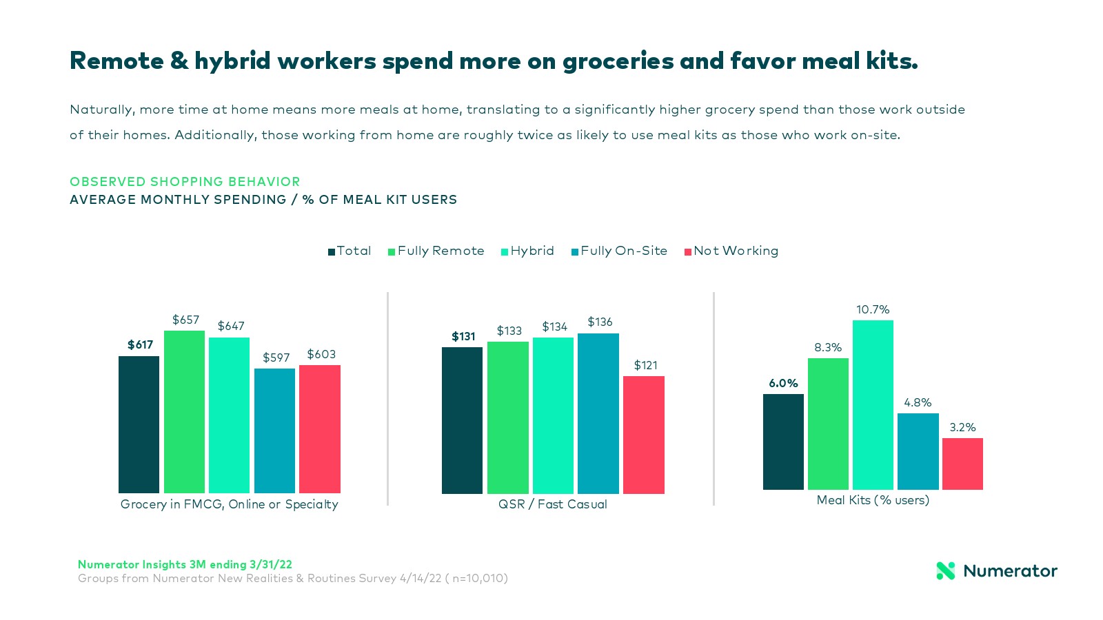 - 在家工作的个人的平均食品杂货支出和餐饮使用率仍然很高,他们的媒体消费和技术使用量也是如此。