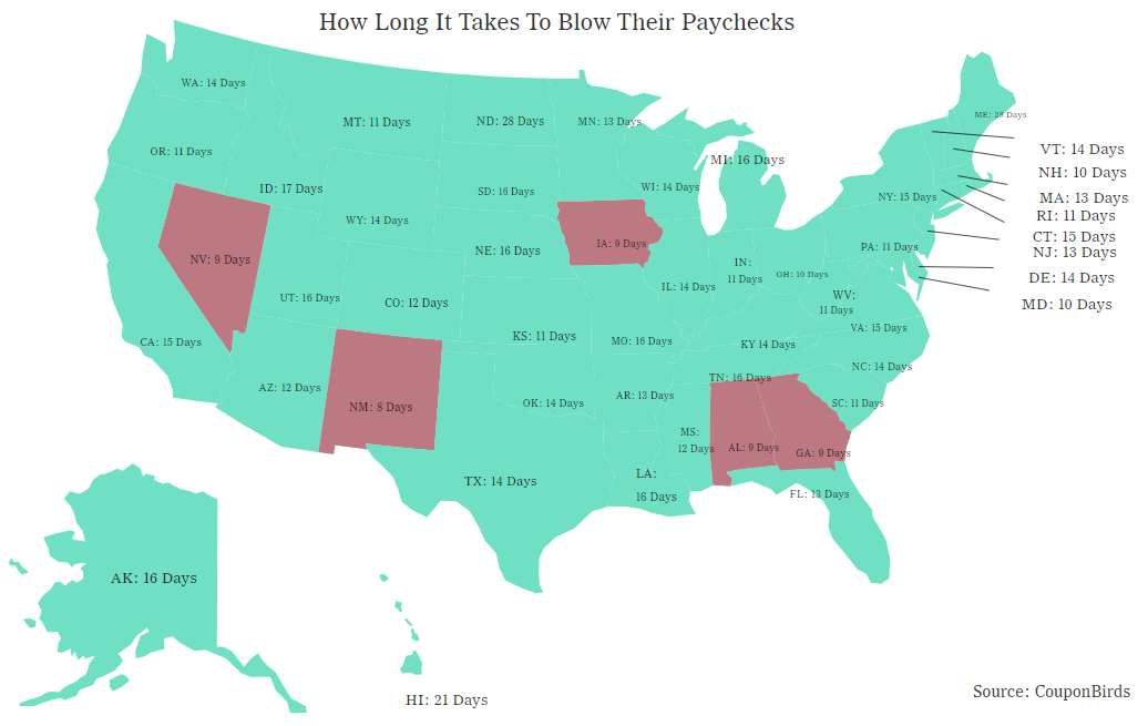 根据CouponBirds.com的调查数据,美国人平均在发工资后的 第14 天,花销就超出了本月的预算,这就导致接下来的半个月他们要么陷入财务困境开始“吃土”,要么不得不动用自己的存款或储蓄来度过本月剩余的时间。当跨州来分析这些数据时,我们发现新墨西哥州的人似乎是发工资后支出最快的人。他们表示,自己在发工资后仅 8 天的时间里就花光了钱。相比之下,缅因州和北达科他州的人似乎已经养成了存钱和储蓄的习惯,这些州的受访者表示,他们基本在发工资后 28 天才用完本月的预算。
