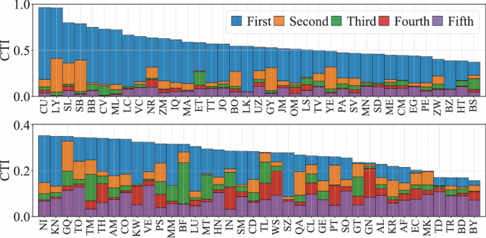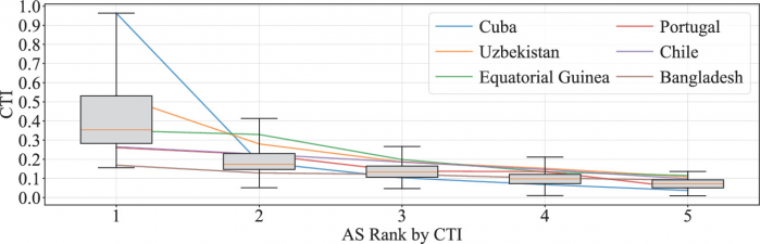 研究配图 – 4:重叠条形图展示了排名靠前的五大 ASes 的 CTI 值