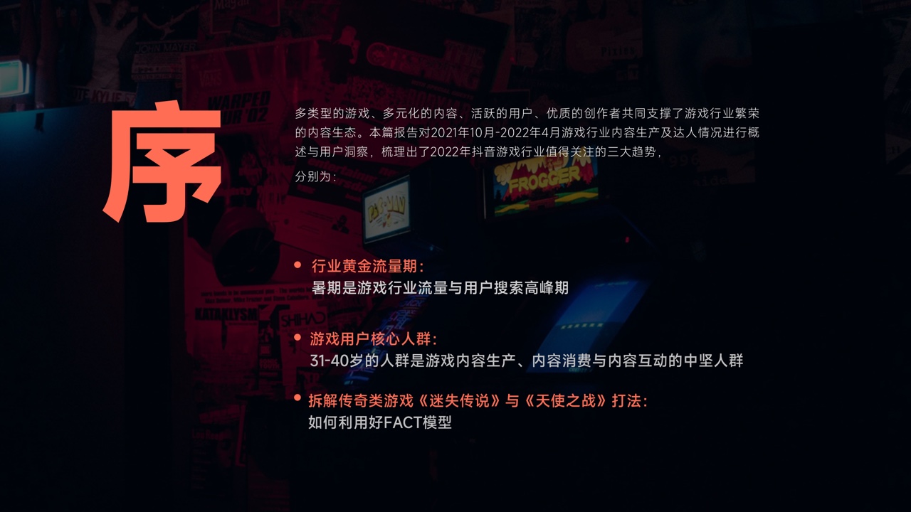 本篇报告是对2021年10月-2022年4月抖音游戏行业内容生产及达人情况进行概述与用户洞察,梳理出了2022年抖音游戏行业值得关注的三大趋势: