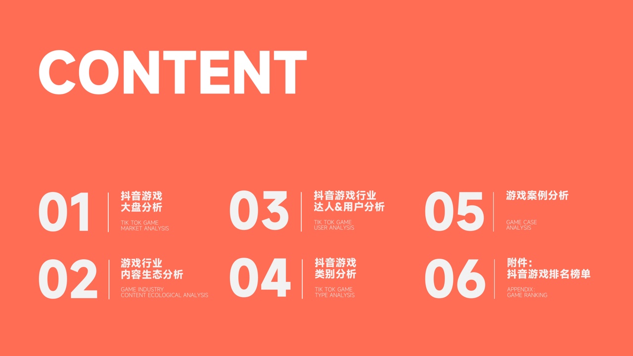 同时,通过这份报告,我们将深入浅出的为大家带来抖音生态下的游戏大盘分析、内容生态分析、达人&用户分析、游戏类别分析、案例分析以及各大抖音游戏榜单等纯干货内容。