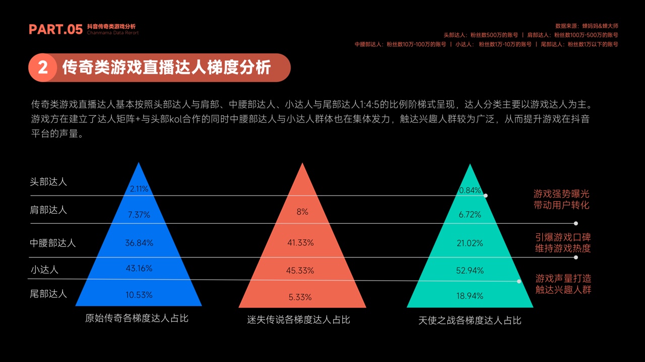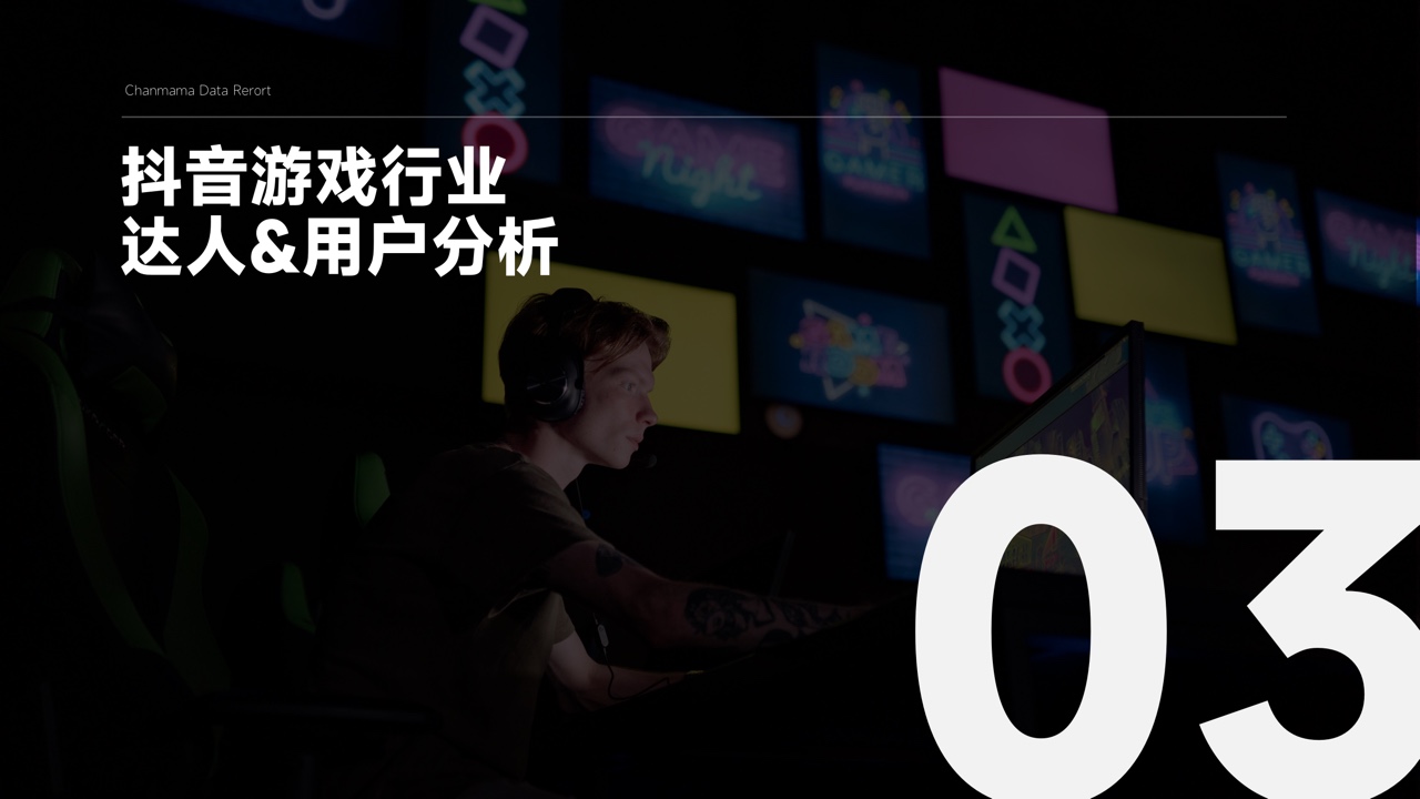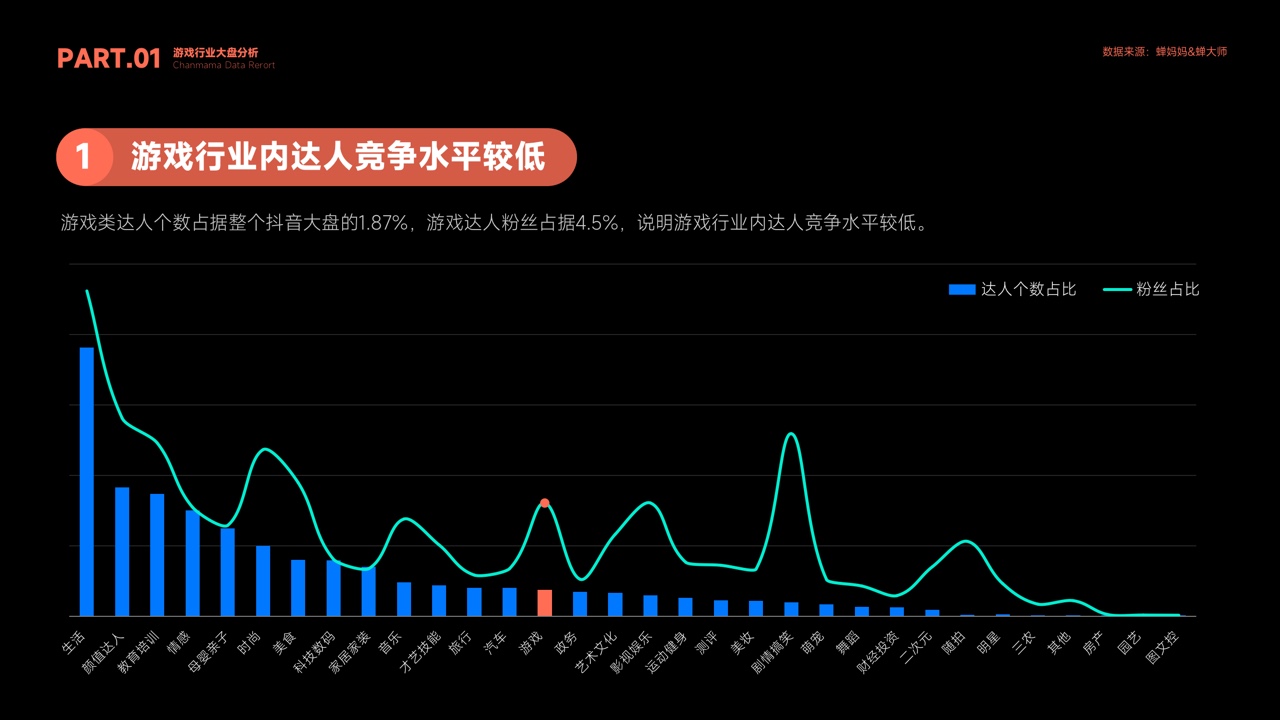 1.抖音生态下的游戏行业内达人竞争水平较低:游戏类达人个数占据整个抖音大盘的1.87%,游戏达人粉丝占据4.5%,说明游戏行业内达人竞争水平较低。