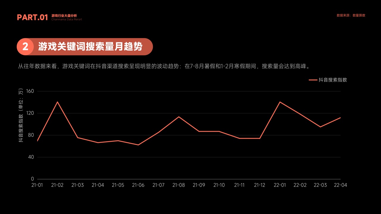 2.游戏关键词在抖音渠道搜索呈现明显的波动趋势:在7-8月暑假和1-2月寒假期间,搜索量会达到高峰。