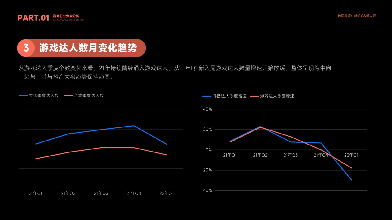 3.从2021年Q2新入局游戏达人数量增速开始放缓:整体呈现稳中向上趋势,并与抖音大盘趋势保持趋同。