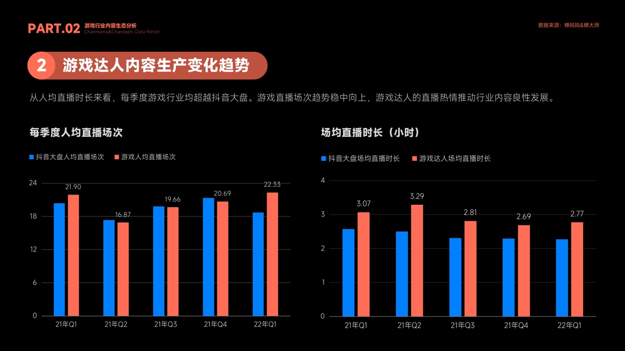 从人均直播时长来看,每季度游戏行业均超越抖音大盘。游戏直播场次趋势稳中向上,游戏达人的直播热情推动行业内容良性发展。