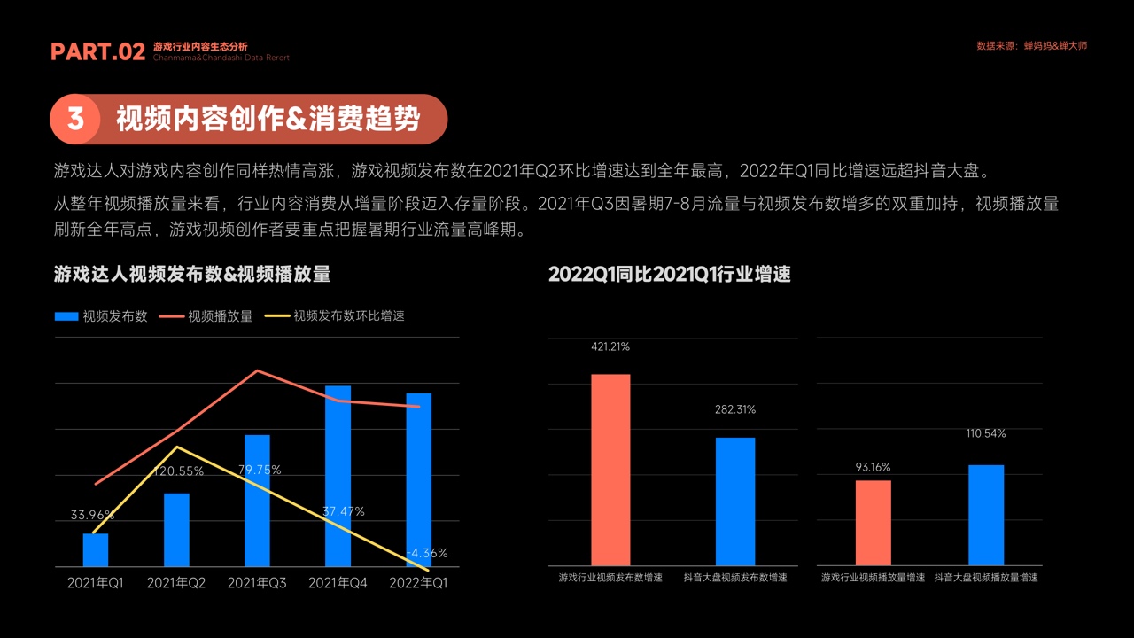 而在游戏内容创作方面,游戏视频发布数在2021年Q2环比增速达到全年最高,2022年Q1同比增速远超抖音大盘。从整年视频播放量来看,行业内容消费从增量阶段迈入存量阶段。