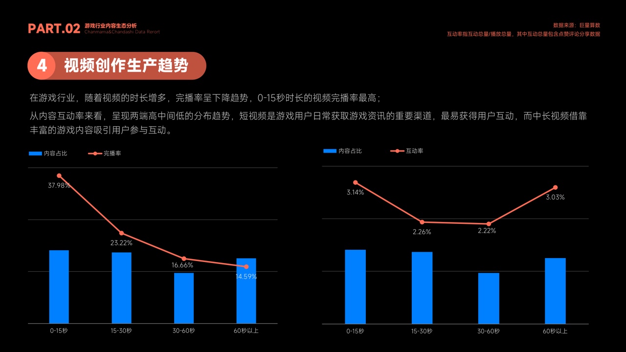 另外,随着视频的时长增多,完播率呈下降趋势,在抖音游戏内容生态下,0-15秒时长的视频完播率最高;从内容互动率来看,呈现两端高中间低的分布趋势,短视频是游戏用户日常获取游戏资讯的重要渠道,最易获得用户互动,而中长视频借靠丰富的游戏内容吸引用户参与互动。