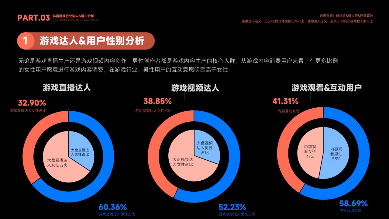 无论是游戏直播生产还是游戏视频内容创作,男性创作者都是游戏内容生产的核心人群。在用户互动上,男性用户的互动意愿也明显高于女性。