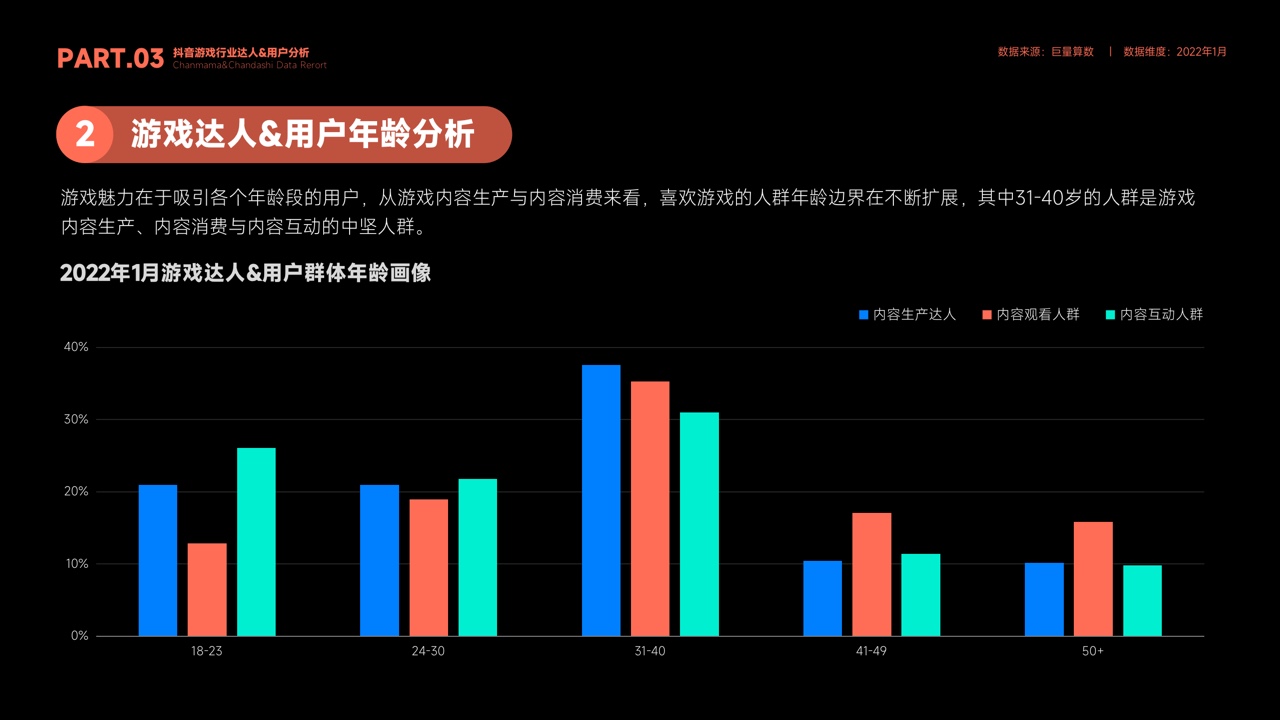 - 游戏用户核心人群:31-40岁的人群是游戏内容生产、内容消费与内容互动的中坚人群;