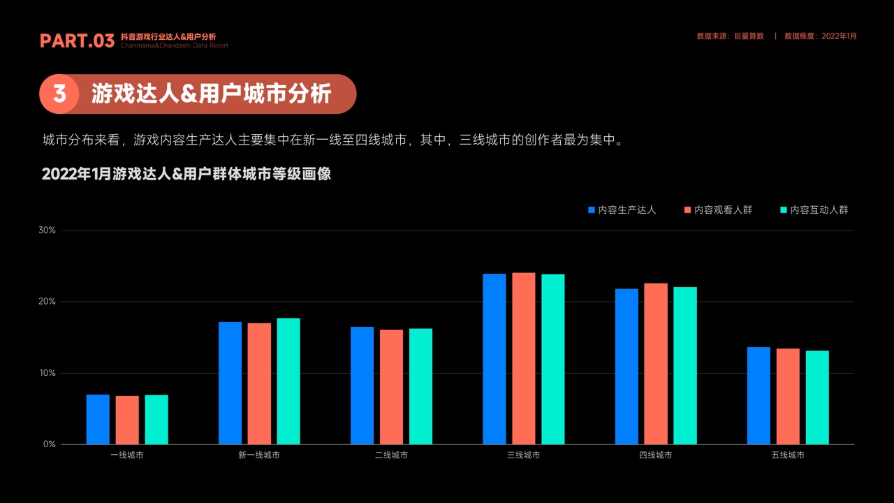 从城市分布来看,游戏内容生产达人主要集中在新一线至四线城市,其中三线城市的创作者最为集中。