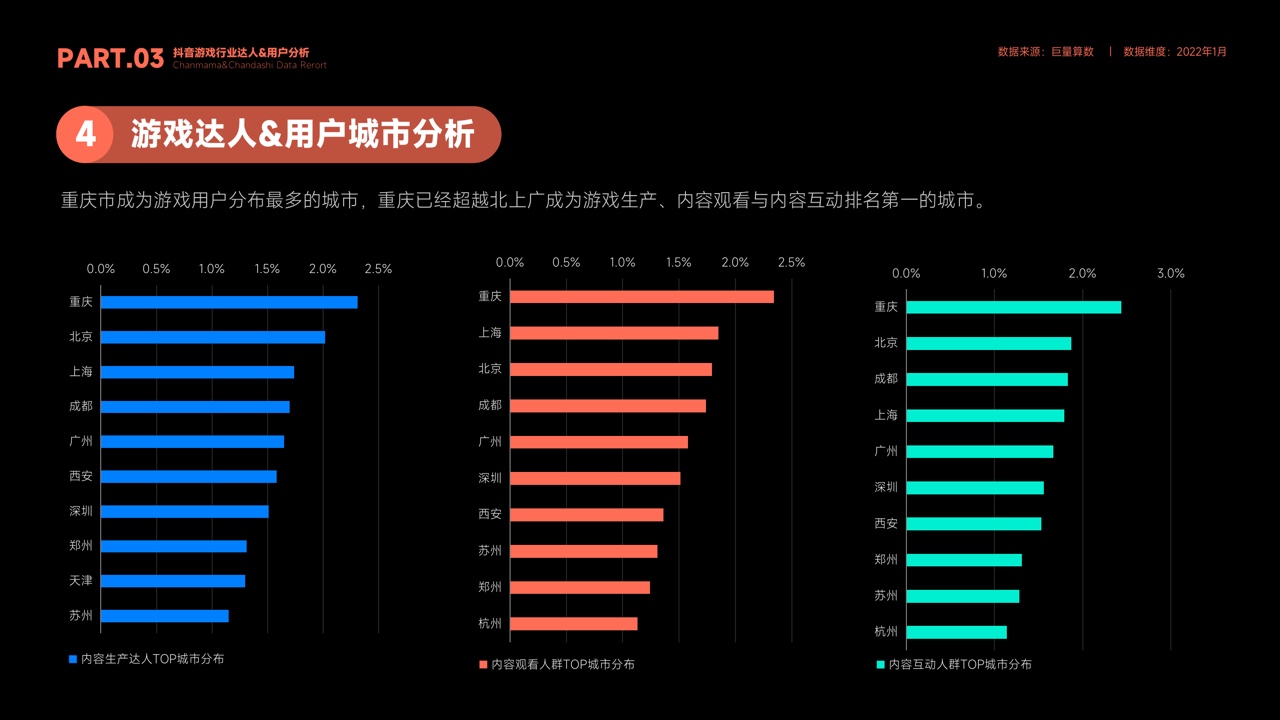 值得一提的是,重庆市成为游戏用户分布最多的城市,重庆已经超越北上广成为游戏生产、内容观看与内容互动排名第一的城市。