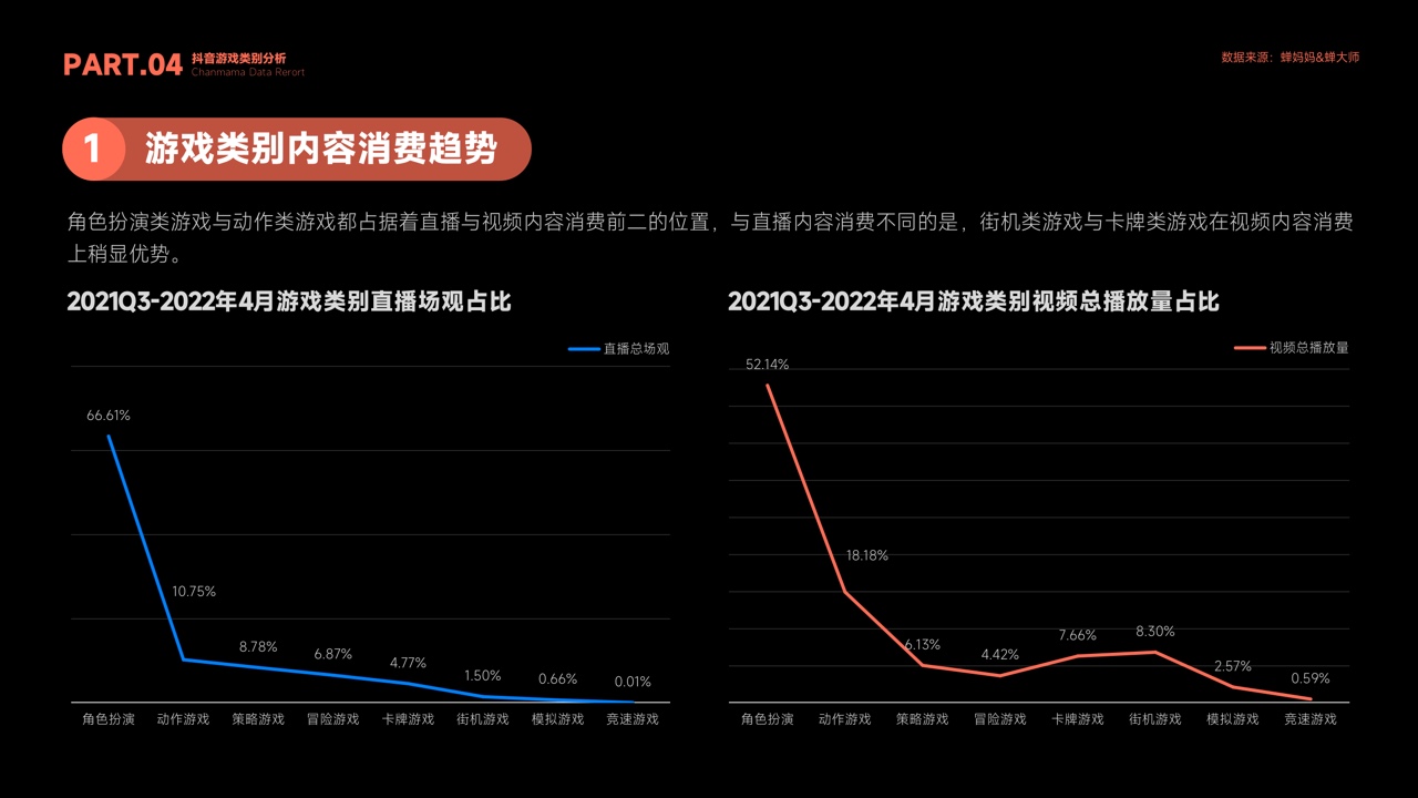 通过分析数据,我们发现抖音游戏生态下,角色扮演类游戏与动作类游戏都占据着直播与视频内容消费前二的位置,与直播内容消费不同的是,街机类游戏与卡牌类游戏在视频内容消费上稍显优势。