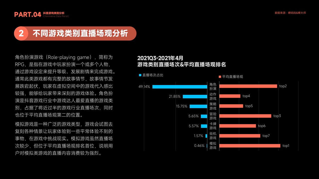 从不同类别游戏的平均直播场观来看,角色扮演类游戏一直保持较为稳定的水平,平均直播场观稳居前三,其下代表游戏有《封灵诀-奇幻修仙侠侣手游》、《仙梦九歌》与《奇门》等热门游戏。