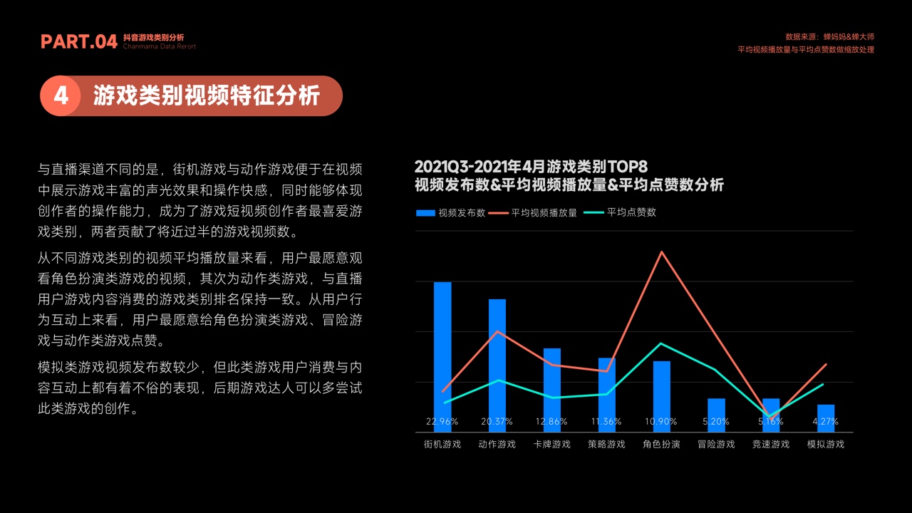 与直播渠道不同的是,街机游戏与动作游戏便于在视频中展示游戏丰富的声光效果和操作快感,同时能够体现创作者的操作能力,成为了游戏短视频创作者最喜爱游戏类别,两者贡献了将近过半的游戏视频数。