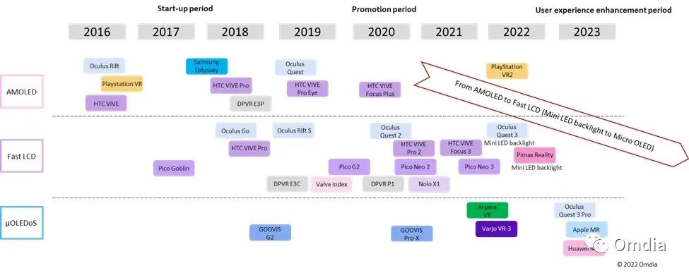用于 VR 应用的显示面板有三个阶段的技术演变。