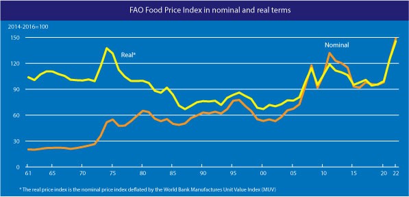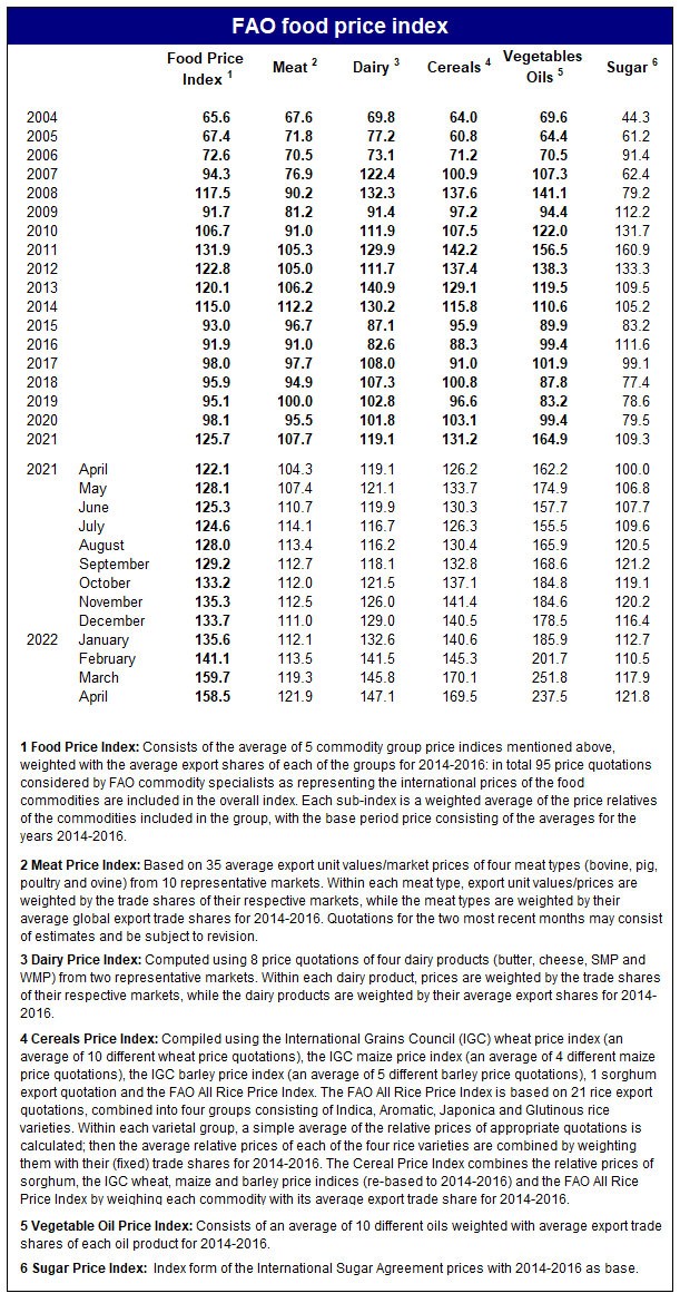 2022年4月,粮农组织食品价格指数(FFPI)平均为158.5点,比3月份创下的历史最高点下降1.2点(0.8%),但同比仍高出36.4点(29.8%)。4月份 FFPI 下降的主要原因是植物油指数大幅下滑,同时谷物价格指数小幅下跌。与此同时,食糖、肉类和奶制品价格指数持续温和上涨。