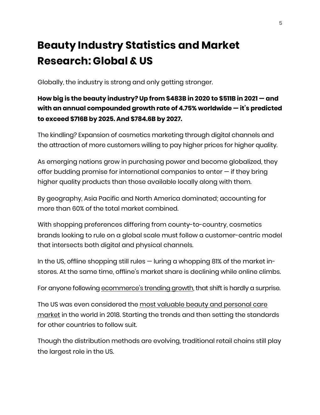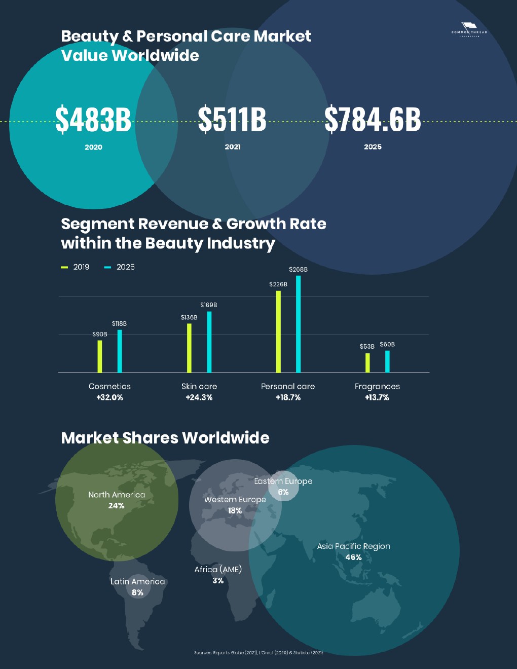在全球范围内,美容行业很强大,而且只会越来越强大。全球美容业从 2020 年的 4830亿美元增长到 2021 年的 5110亿美元。到2025年全球美容业年均复合增长率为 4.75%,即到 2025 年将超过 7160亿美元,到2027 年将超过 7846亿美元。