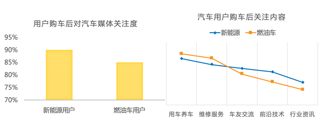 报告指出,相比新能源车用户,燃油车用户对价格敏感程度更高,新能源车则较多采用直营等销售模式,透明化、标准化让用户对价格有更清晰的认知。在购买车辆后,燃油车用户更关注用车养车和车辆维修,新能源车用户则更关注车友交流、前沿技术和行业资讯。